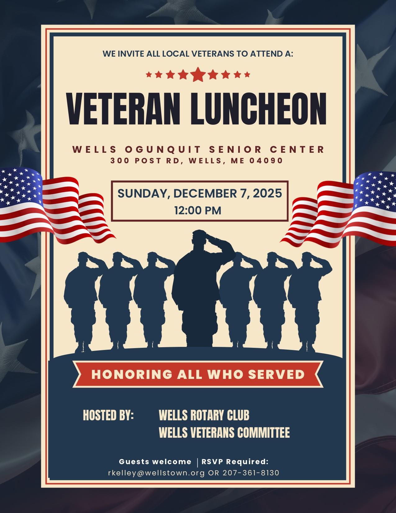 The Wells Rotary Club and the Wells Veterans Committee invite all local veterans to join us for a special luncheon in recognition of your service to our country. This annual gathering is an opportunity for our community to come together, share a meal, and express our gratitude to those who have served.