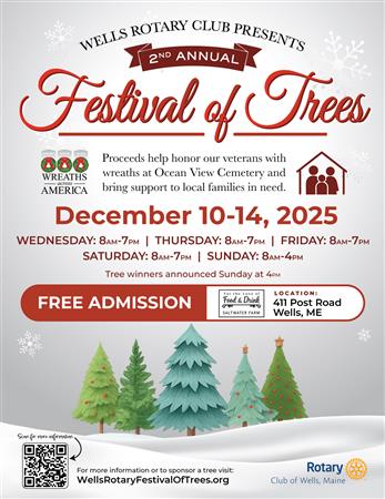 The Wells Rotary Club is bringing back the Festival of Trees this December! Come experience the magic of beautifully decorated trees while supporting two wonderful causes: honoring our veterans and helping local families in need.